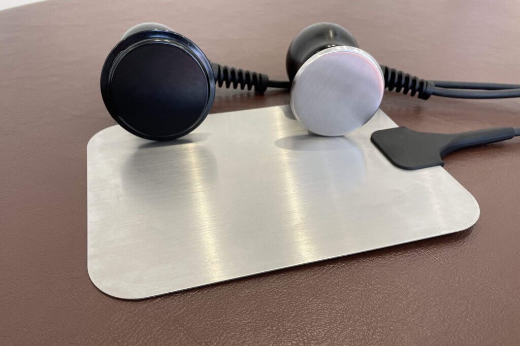 『高周波』と呼ばれる電気刺激により、体を内側から温められます。プローブ(電極)とアースではさむことで、体の芯に熱を送ります。